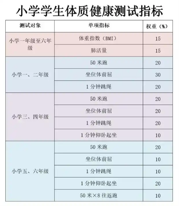 根据《国家学生体质健康标准(2014年修订)》,小学1-6年级体测项目虽包含身高体重(BMI)、肺活量、50米跑等基础项,但不同年级的项目权重和评分标准差异显著,家长需针对性规划训练: