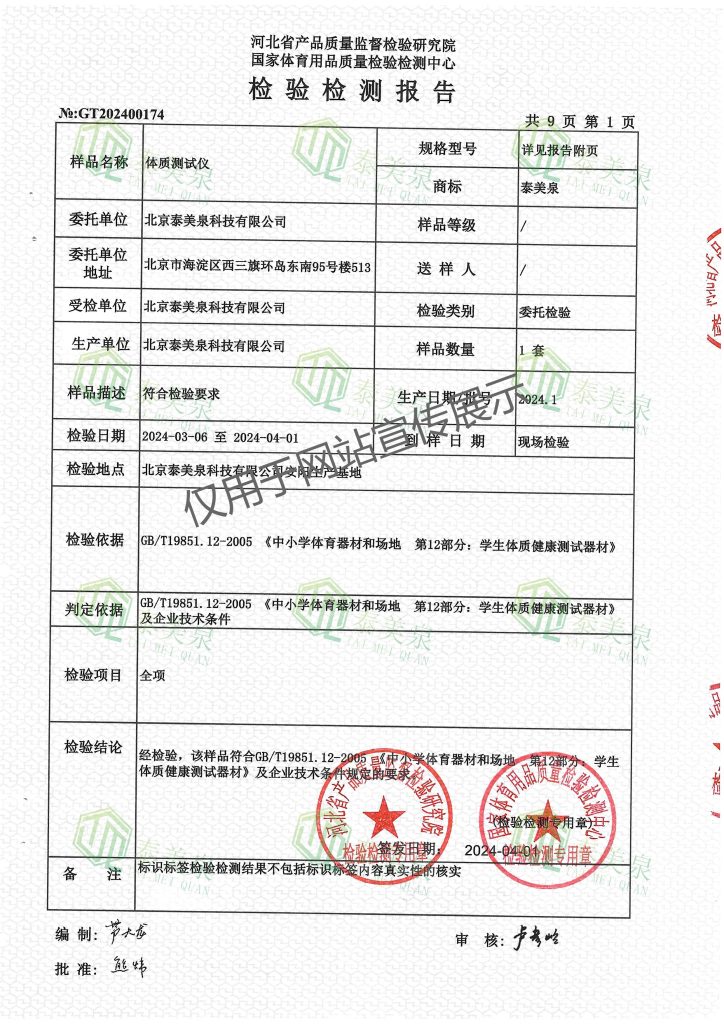 泰美泉跳绳测试仪具有国家体育用品质量检验检测中心出具的检验检测报告,符合GB/T19851.12-2005《中小学体育器材和场地 第12部分:学生体质健康测试器材》国家标准,消费者可放心选购。