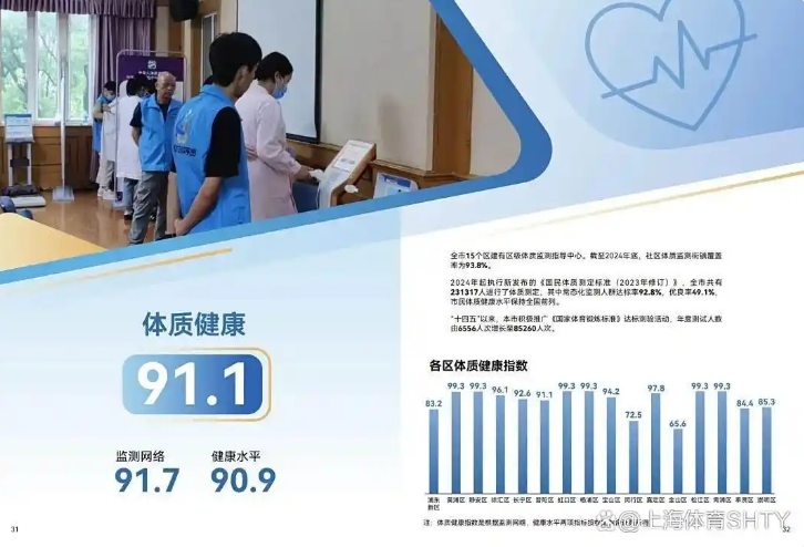 体质健康方面,全市15个区建有区级体质监测指导中心,截至2024年底,社区体质监测街镇覆盖率为93.8%。2024年起执行新发布的《国民体质测定标准(2023年修订)》,全市共有231317人进行了体质测定,其中常态化监测人群达标率92.8%,优良率49.1%,市民体质健康水平保持全国前列。“十四五”以来,本市积极推广《国家体育锻炼标准》达标测验活动,年度测试人数由6556人次增长至85260人次。