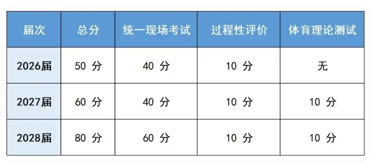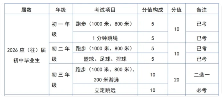 重点提醒:2026届(2023年入学)不考体育理论,但2027届(2024年入学)、2028届(2025年入学)的孩子,要在初三时增考一门体育理论,分值10分,直接计入总分!