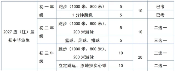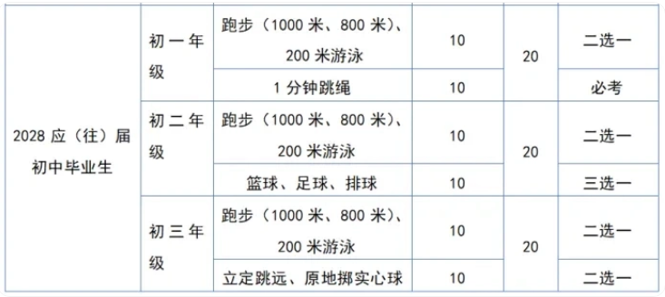 2028届(2025年入学):初一到初三时,每年可在1000米/800米跑、200米游泳中二选一;初三时可在立定跳远、原地掷实心球中二选一;球类依旧是足球、篮球、排球三选一。