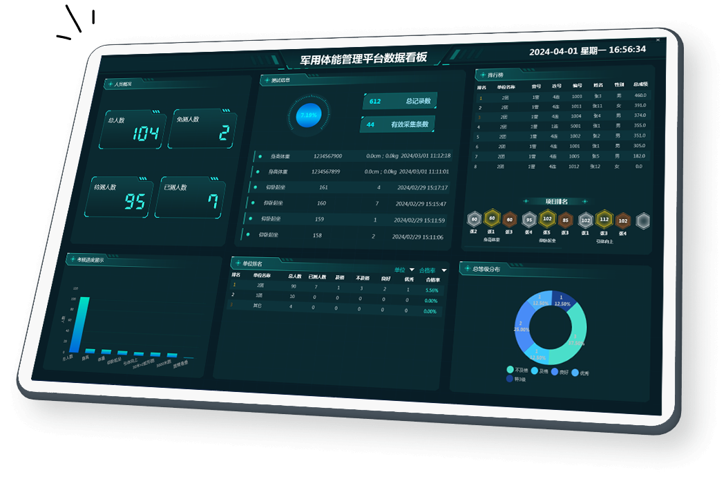 融合智能识别、视觉呈现、心率感知等新型技术,针对士兵日常训练考核与评估、大型体能测试考核等需求提供一站式解决方案。
